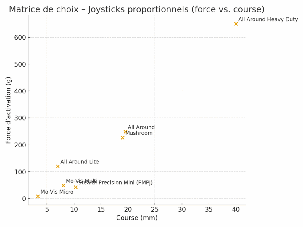 Selon la force résiduelle, l’amplitude et la zone d’accès, nous proposons plusieurs joysticks proportionnels alternatifs :