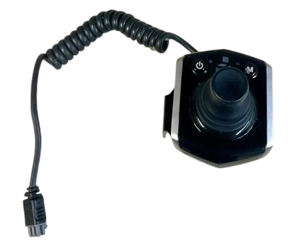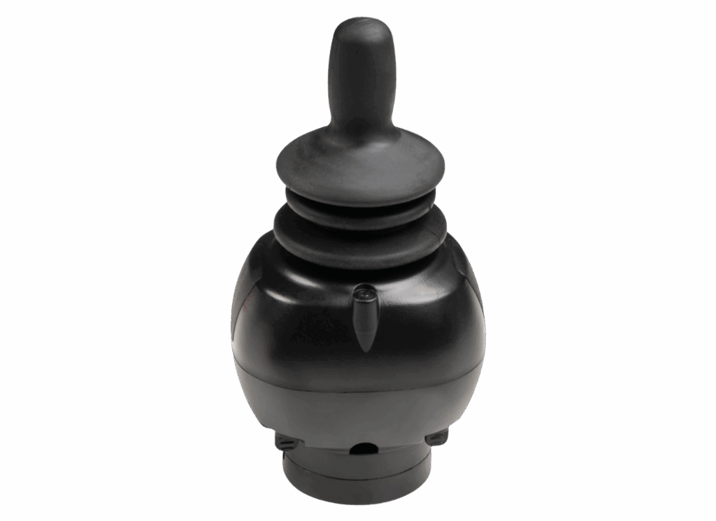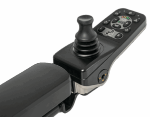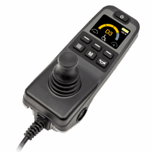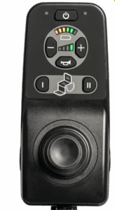 Une commande proportionnelle permet un contrôle sur 360°, une gestion fine de la vitesse et des mouvements précis : plus le levier s’éloigne du centre, plus le fauteuil accélère, avec la possibilité d’avancer très lentement sur de petites impulsions.