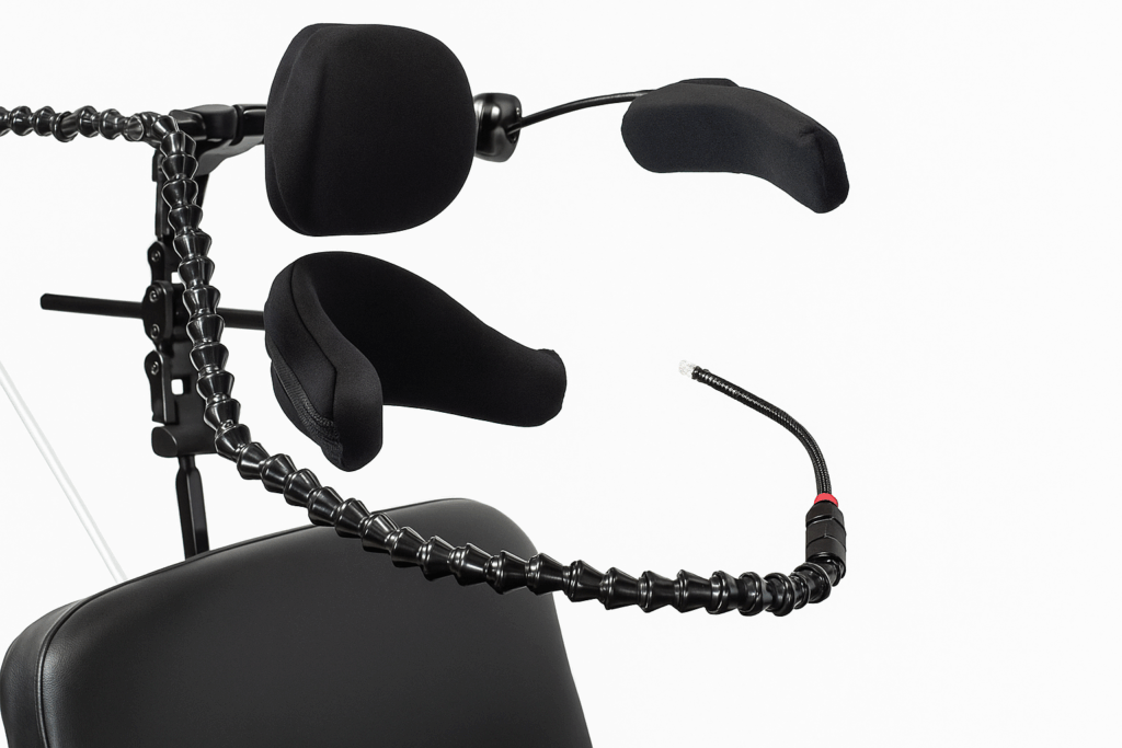 Commande au souffle i-Connect : utilisation au souffle de la commande Qlogic 3 du fauteuil, montage tête à l’aide de supports et tubulures.