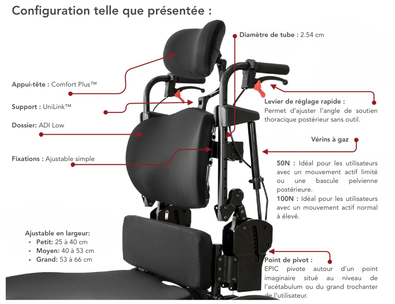 Epic Seating permet aux aidants d’ajuster facilement et rapidement la posture de l’utilisateur sans outils. L’angle du dossier et l’amplitude du mouvement sont modifiables sans équipement particulier.