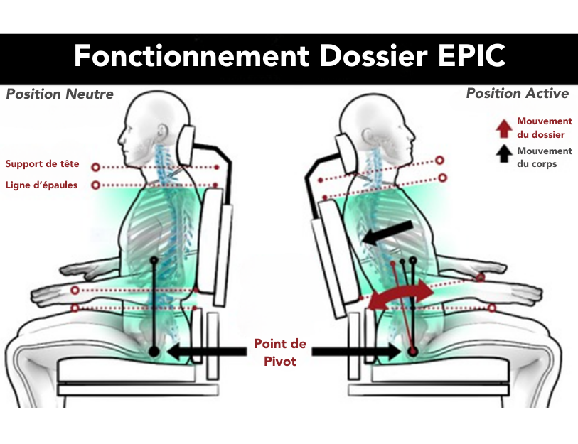 Le système intègre un support pelvien fixe ajustable associé à un dossier mobile. Il comprend également un point de pivot anatomique, permettant de faciliter le mouvement sans modifier la configuration des dispositifs de soutien à la posture.