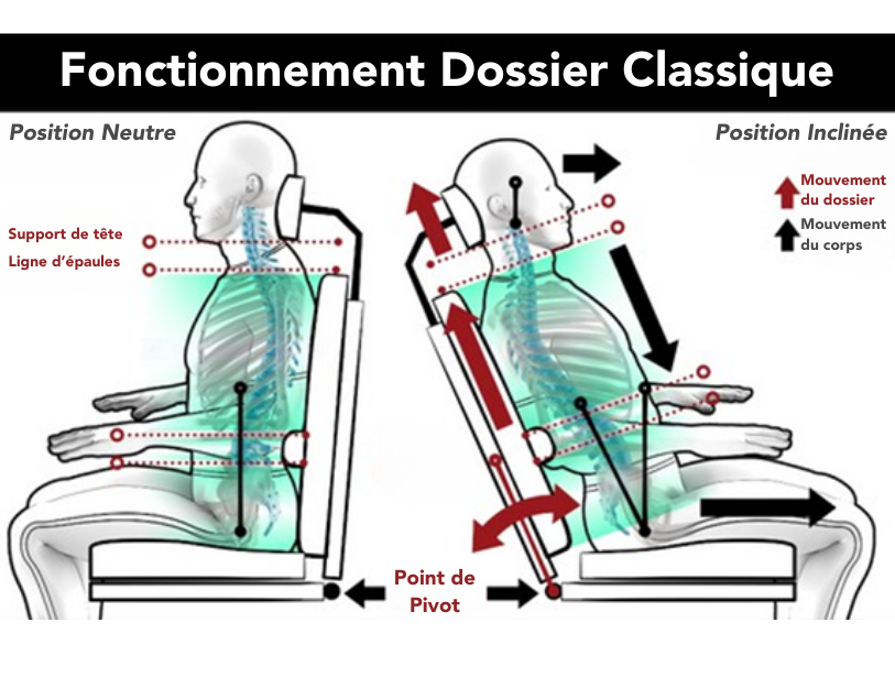 Lorsque le dossier s’incline, il glisse vers le haut par rapport au corps de l’utilisateur, ce qui génère des forces de friction et de cisaillement. Lors du retour en position neutre, un glissement se produit au niveau du bassin, entraînant à nouveau des forces de friction et de cisaillement sur la surface de l’assise.