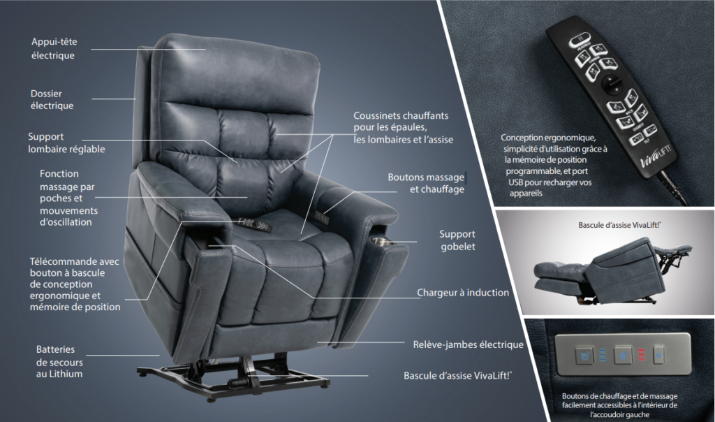 Le fauteuil releveur Viva ULTRA® Ultra, équipé de 5 moteurs, redéfinit le confort et la relaxation en offrant une expérience d’inclinaison inégalée. Contrairement aux autres fauteuils inclinables à commande électrique, le VivaLift!® Ultra va encore plus loin en proposant une multitude de positions pour une détente totale et réparatrice.